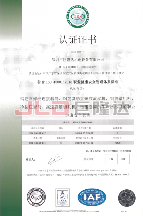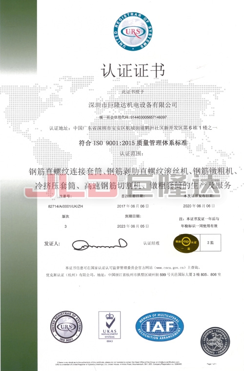 深圳市巨隆達(dá)機(jī)電設(shè)備有限公司成立于 2010 年,是一家專業(yè)生產(chǎn)鋼筋加工成套設(shè)備、連接套筒系列產(chǎn)品的制造商,是一家集研發(fā)、生產(chǎn)、銷售、出口、服務(wù)為一體的綜合型企業(yè)。本公司獲得國家發(fā)明專利和使用新型專利20余項(xiàng),擁有專業(yè)的研發(fā)團(tuán)隊(duì)、先進(jìn)的生產(chǎn)設(shè)備,完善的產(chǎn)品檢測手段和質(zhì)量保證體系。通過了建研院檢測中心有限公司檢測、符合英國 UKAS:ISO 9001:2015質(zhì)量管理體系標(biāo)準(zhǔn)認(rèn)證企業(yè)、ISO 14001:2015 環(huán)境管理體系標(biāo)準(zhǔn)、ISO45001:2018 健康安全管理體系標(biāo)準(zhǔn)。達(dá)到深圳市寶安區(qū)環(huán)境保護(hù)和水務(wù)局建設(shè)項(xiàng)目環(huán)境影響審查批復(fù)企業(yè)、榮獲深圳平安金融中心工程 2015年度優(yōu)秀材料、設(shè)備供應(yīng)商稱號企業(yè),多年連續(xù)榮獲廣東省守合同重信用企業(yè)稱號。